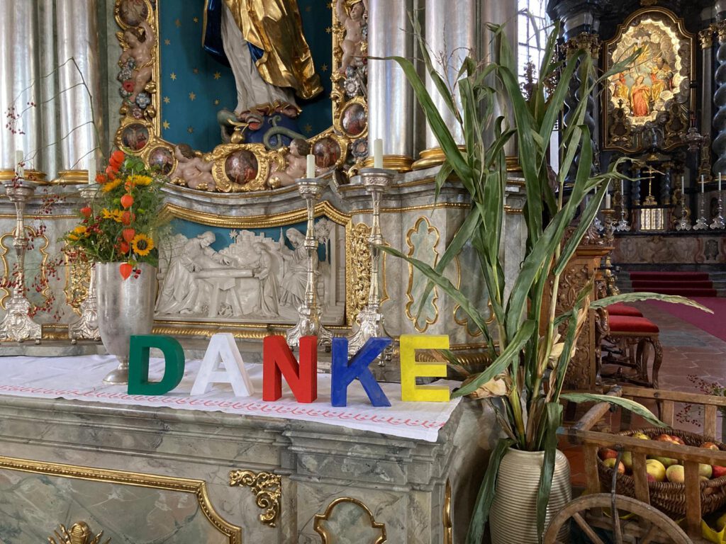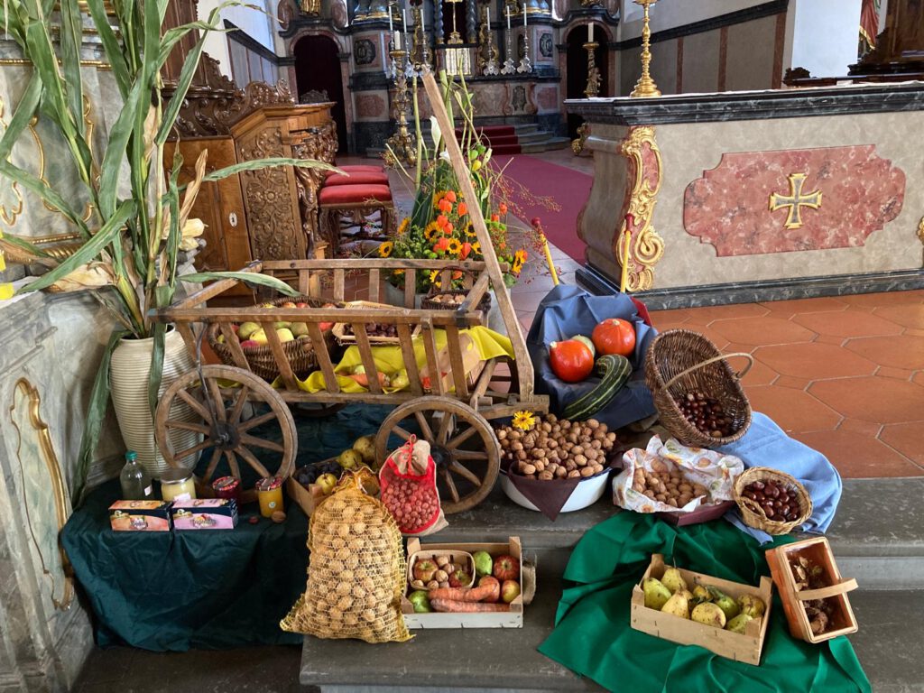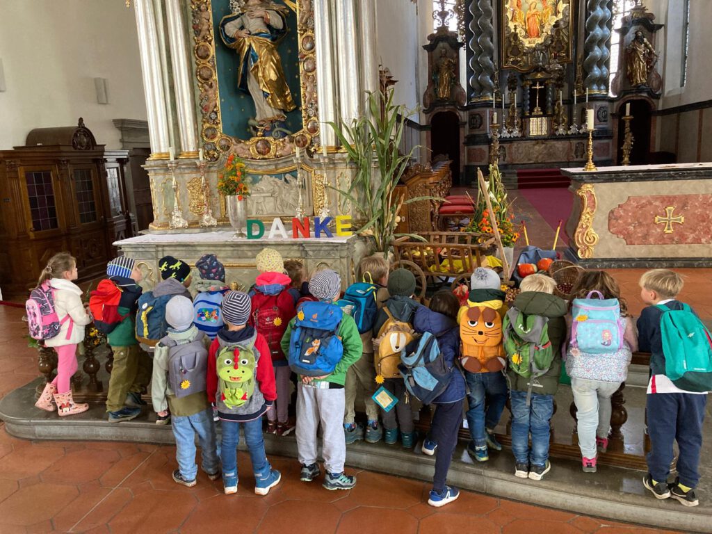 Traditionell wird in vielen Teilen der Erde im Herbst das Erntedankfest gefeiert. Wir danken Gott für die Gaben der Ernte. Auch im Eugen Bolz Kindergarten feiern wir gruppenintern das Erntedankfest, mit Liedern, Gebeten und kleinen Gaben. Bei  strahlendem Sonnenschein jedoch frischem Herbstwind liefen die Kinder des Kindergartens in die Pfarrkirche St. Peter um den dortigen Erntedankaltar anzuschauen.