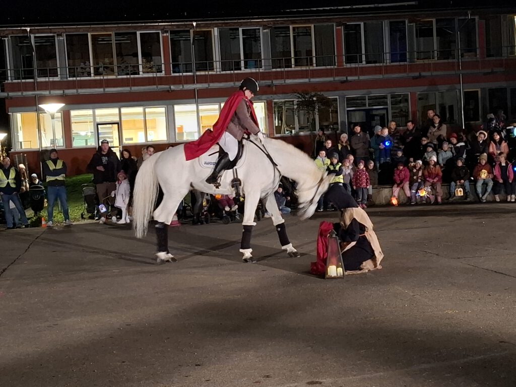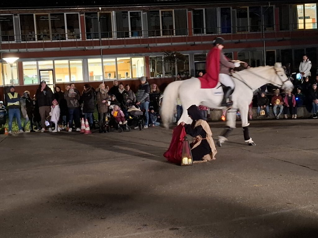 Ein besonderes Highlight war, wie Sankt Martin auf seinem Pferd, in seinem roten Mantel eindrucksvoll durch die Menge ritt. Gemeinsam mit dem Bettler wurde die Martinsgeschichte nachgespielt. Die Kinder verfolgten gespannt, wie St. Martin seinen Mantel teilte und dem frierenden Bettler half – ein schönes Sinnbild für das Teilen und helfen, das wir auch im Alltag leben möchten.